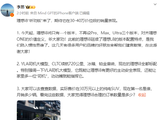 1. 今天起,理想i8将只有一个版本,不再设Pro、Max、Ultra三个版本,对齐理想ONE的价值定义,听大家劝!此前的理想i8延续了理想L8的版本配置特点,是我们陷入惯性思维了。这几天有很多用户和品牌的好朋友来帮我们建言献策,在此感谢大家!